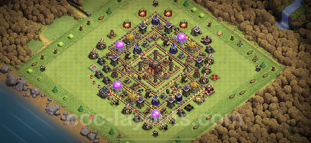 This Town Hall 10 hybrid base offers the best of both worlds - strong resource protection combined with effective trophy defense. The versatile design makes it an excellent choice for players who want to protect their loot while maintaining their trophy count. This balanced approach ensures you don't sacrifice one aspect of defense for another, making it ideal for active players across all league levels. The hybrid layout features centralized resource storages alongside a well-protected Town Hall, with multiple defensive layers that deter both farming raids and trophy pushers. High-value targets are strategically positioned within overlapping defense ranges, forcing attackers to make difficult choices about which objectives to prioritize. The compartmentalized design prevents attackers from easily achieving both loot destruction and the Town Hall kill in a single attack. Defense placement in this hybrid base creates strong coverage against both ground and air attacks. Inferno Towers, X-Bows, and Eagle Artillery work in concert to eliminate threats quickly, while splash damage defenses like Wizard Towers and Bomb Towers counter swarm strategies. The base's funnel-resistant design and strategic trap placement make it effective against popular attack strategies including QC LaLoon (Queen Charge Lava Hound Balloon), Blizzard attacks, and Yeti Smash compositions.