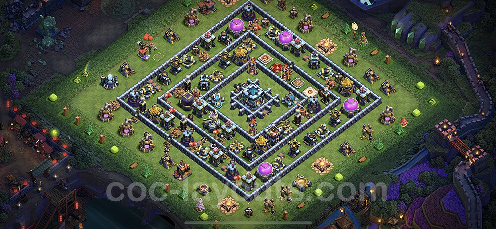 This Town Hall 13 hybrid base offers the best of both worlds - strong resource protection combined with effective trophy defense. The versatile design makes it an excellent choice for players who want to protect their loot while maintaining their trophy count. This balanced approach ensures you don't sacrifice one aspect of defense for another, making it ideal for active players across all league levels. The hybrid layout features centralized resource storages alongside a well-protected Town Hall, with multiple defensive layers that deter both farming raids and trophy pushers. High-value targets are strategically positioned within overlapping defense ranges, forcing attackers to make difficult choices about which objectives to prioritize. The compartmentalized design prevents attackers from easily achieving both loot destruction and the Town Hall kill in a single attack. Defense placement in this hybrid base creates strong coverage against both ground and air attacks. Inferno Towers, X-Bows, and Eagle Artillery work in concert to eliminate threats quickly, while splash damage defenses like Wizard Towers and Bomb Towers counter swarm strategies. The base's funnel-resistant design and strategic trap placement make it effective against popular attack strategies including QC LaLoon (Queen Charge Lava Hound Balloon), Blizzard attacks, and Yeti Smash compositions.