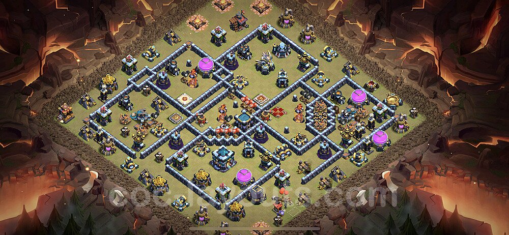 This Town Hall 13 war base is specifically designed to defend against 2-star and 3-star attacks in Clan Wars and Clan War Leagues. The strategic placement of defenses creates multiple compartments that force attackers to use more troops and spells than anticipated. Key defensive structures like Eagle Artillery, Inferno Towers, and X-Bows are positioned to cover crucial sections of the base, making it extremely difficult for opponents to secure a perfect attack. The core of this war base features a centralized Town Hall and Clan Castle, protected by multiple layers of walls and high-damage defenses. This layout forces attackers to commit significant resources just to reach the center, often leaving them without enough firepower to secure the Town Hall destruction. The anti-2-star design ensures that even if attackers breach the outer defenses, they'll struggle to achieve a 50% destruction rating. Air defenses are strategically spread to counter popular air attack strategies like LaLoon (Lava Hound + Balloons) and Electrone (Electro Dragons + Stone Slammer). The symmetrical trap placement and strategic Hidden Tesla positions create deadly surprise elements that can completely derail an attacker's plan. This base has been tested against various meta attack strategies and has consistently proven effective in preventing 3-star attacks.