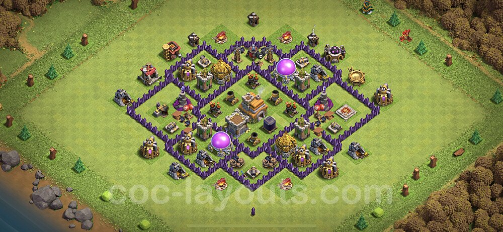 This Town Hall 7 hybrid base offers the best of both worlds - strong resource protection combined with effective trophy defense. The versatile design makes it an excellent choice for players who want to protect their loot while maintaining their trophy count. This balanced approach ensures you don't sacrifice one aspect of defense for another, making it ideal for active players across all league levels. The hybrid layout features centralized resource storages alongside a well-protected Town Hall, with multiple defensive layers that deter both farming raids and trophy pushers. High-value targets are strategically positioned within overlapping defense ranges, forcing attackers to make difficult choices about which objectives to prioritize. The compartmentalized design prevents attackers from easily achieving both loot destruction and the Town Hall kill in a single attack. Defense placement in this hybrid base creates strong coverage against both ground and air attacks. Inferno Towers, X-Bows, and Eagle Artillery work in concert to eliminate threats quickly, while splash damage defenses like Wizard Towers and Bomb Towers counter swarm strategies. The base's funnel-resistant design and strategic trap placement make it effective against popular attack strategies including QC LaLoon (Queen Charge Lava Hound Balloon), Blizzard attacks, and Yeti Smash compositions.