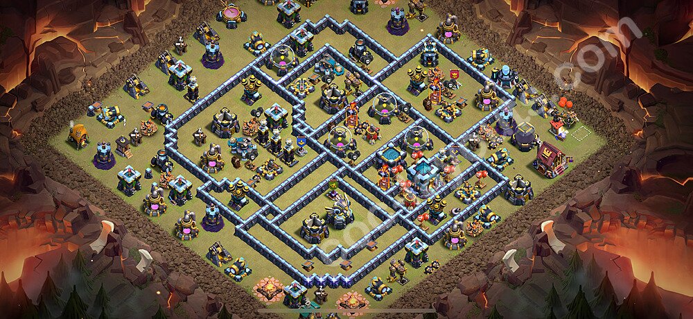 This Town Hall 13 war base is specifically designed to defend against 2-star and 3-star attacks in Clan Wars and Clan War Leagues. The strategic placement of defenses creates multiple compartments that force attackers to use more troops and spells than anticipated. Key defensive structures like Eagle Artillery, Inferno Towers, and X-Bows are positioned to cover crucial sections of the base, making it extremely difficult for opponents to secure a perfect attack. The core of this war base features a centralized Town Hall and Clan Castle, protected by multiple layers of walls and high-damage defenses. This layout forces attackers to commit significant resources just to reach the center, often leaving them without enough firepower to secure the Town Hall destruction. The anti-2-star design ensures that even if attackers breach the outer defenses, they'll struggle to achieve a 50% destruction rating. Air defenses are strategically spread to counter popular air attack strategies like LaLoon (Lava Hound + Balloons) and Electrone (Electro Dragons + Stone Slammer). The symmetrical trap placement and strategic Hidden Tesla positions create deadly surprise elements that can completely derail an attacker's plan. This base has been tested against various meta attack strategies and has consistently proven effective in preventing 3-star attacks.