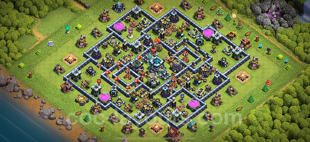 This Town Hall 13 war base is specifically designed to defend against 2-star and 3-star attacks in Clan Wars and Clan War Leagues. The strategic placement of defenses creates multiple compartments that force attackers to use more troops and spells than anticipated. Key defensive structures like Eagle Artillery, Inferno Towers, and X-Bows are positioned to cover crucial sections of the base, making it extremely difficult for opponents to secure a perfect attack. The core of this war base features a centralized Town Hall and Clan Castle, protected by multiple layers of walls and high-damage defenses. This layout forces attackers to commit significant resources just to reach the center, often leaving them without enough firepower to secure the Town Hall destruction. The anti-2-star design ensures that even if attackers breach the outer defenses, they'll struggle to achieve a 50% destruction rating. Air defenses are strategically spread to counter popular air attack strategies like LaLoon (Lava Hound + Balloons) and Electrone (Electro Dragons + Stone Slammer). The symmetrical trap placement and strategic Hidden Tesla positions create deadly surprise elements that can completely derail an attacker's plan. This base has been tested against various meta attack strategies and has consistently proven effective in preventing 3-star attacks.