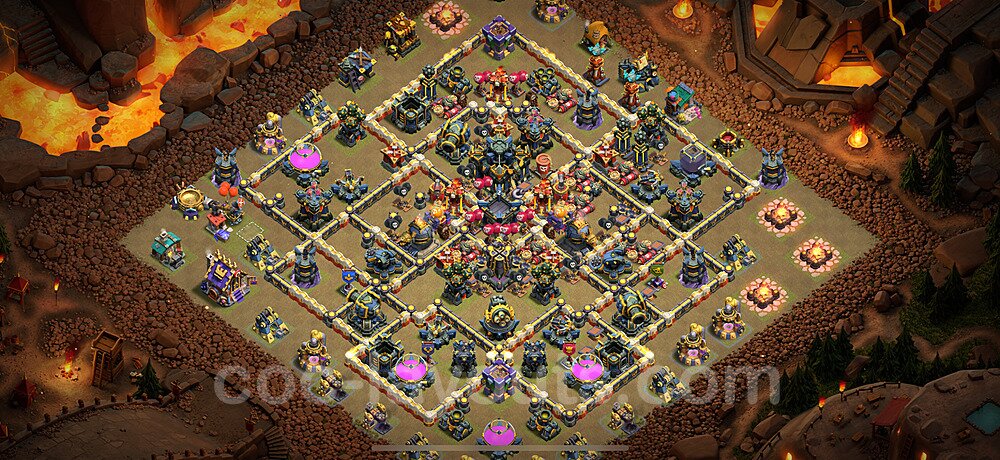 This Town Hall 17 war base is specifically designed to defend against 2-star and 3-star attacks in Clan Wars and Clan War Leagues. The strategic placement of defenses creates multiple compartments that force attackers to use more troops and spells than anticipated. Key defensive structures like Eagle Artillery, Inferno Towers, and X-Bows are positioned to cover crucial sections of the base, making it extremely difficult for opponents to secure a perfect attack. The core of this war base features a centralized Town Hall and Clan Castle, protected by multiple layers of walls and high-damage defenses. This layout forces attackers to commit significant resources just to reach the center, often leaving them without enough firepower to secure the Town Hall destruction. The anti-2-star design ensures that even if attackers breach the outer defenses, they'll struggle to achieve a 50% destruction rating. Air defenses are strategically spread to counter popular air attack strategies like LaLoon (Lava Hound + Balloons) and Electrone (Electro Dragons + Stone Slammer). The symmetrical trap placement and strategic Hidden Tesla positions create deadly surprise elements that can completely derail an attacker's plan. This base has been tested against various meta attack strategies and has consistently proven effective in preventing 3-star attacks.