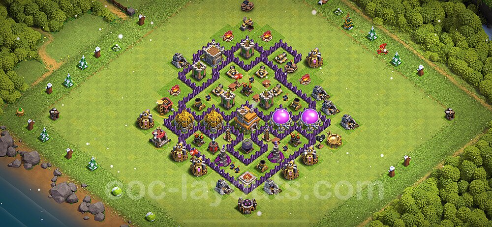 This Town Hall 7 hybrid base offers the best of both worlds - strong resource protection combined with effective trophy defense. The versatile design makes it an excellent choice for players who want to protect their loot while maintaining their trophy count. This balanced approach ensures you don't sacrifice one aspect of defense for another, making it ideal for active players across all league levels. The hybrid layout features centralized resource storages alongside a well-protected Town Hall, with multiple defensive layers that deter both farming raids and trophy pushers. High-value targets are strategically positioned within overlapping defense ranges, forcing attackers to make difficult choices about which objectives to prioritize. The compartmentalized design prevents attackers from easily achieving both loot destruction and the Town Hall kill in a single attack. Defense placement in this hybrid base creates strong coverage against both ground and air attacks. Inferno Towers, X-Bows, and Eagle Artillery work in concert to eliminate threats quickly, while splash damage defenses like Wizard Towers and Bomb Towers counter swarm strategies. The base's funnel-resistant design and strategic trap placement make it effective against popular attack strategies including QC LaLoon (Queen Charge Lava Hound Balloon), Blizzard attacks, and Yeti Smash compositions.