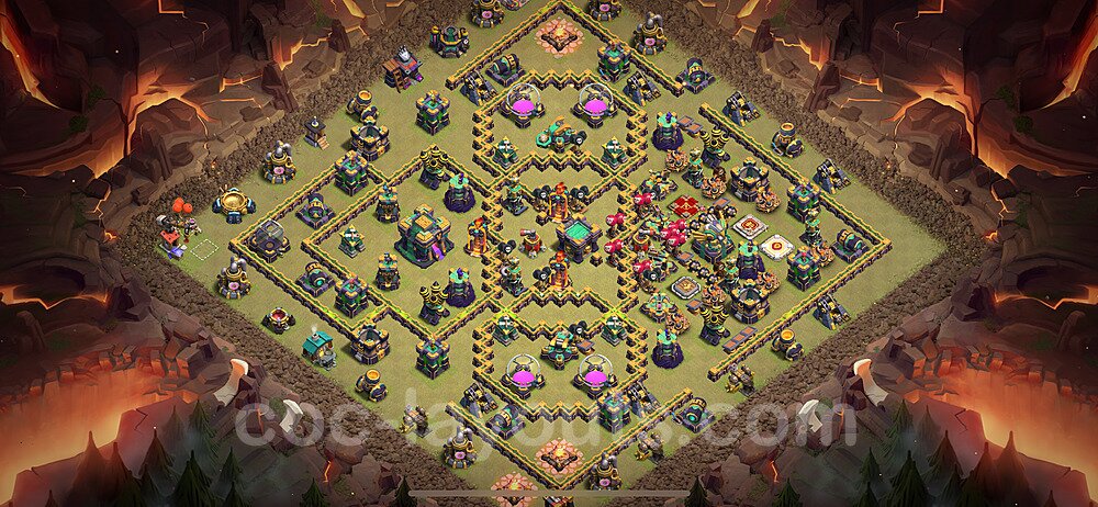 This Town Hall 14 war base is specifically designed to defend against 2-star and 3-star attacks in Clan Wars and Clan War Leagues. The strategic placement of defenses creates multiple compartments that force attackers to use more troops and spells than anticipated. Key defensive structures like Eagle Artillery, Inferno Towers, and X-Bows are positioned to cover crucial sections of the base, making it extremely difficult for opponents to secure a perfect attack. The core of this war base features a centralized Town Hall and Clan Castle, protected by multiple layers of walls and high-damage defenses. This layout forces attackers to commit significant resources just to reach the center, often leaving them without enough firepower to secure the Town Hall destruction. The anti-2-star design ensures that even if attackers breach the outer defenses, they'll struggle to achieve a 50% destruction rating. Air defenses are strategically spread to counter popular air attack strategies like LaLoon (Lava Hound + Balloons) and Electrone (Electro Dragons + Stone Slammer). The symmetrical trap placement and strategic Hidden Tesla positions create deadly surprise elements that can completely derail an attacker's plan. This base has been tested against various meta attack strategies and has consistently proven effective in preventing 3-star attacks.
