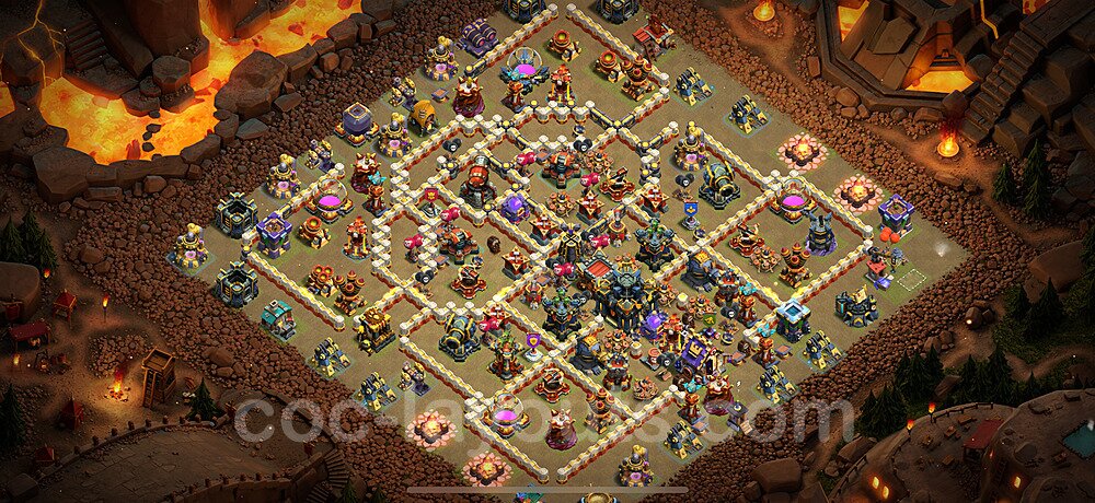 This Town Hall 17 war base is specifically designed to defend against 2-star and 3-star attacks in Clan Wars and Clan War Leagues. The strategic placement of defenses creates multiple compartments that force attackers to use more troops and spells than anticipated. Key defensive structures like Eagle Artillery, Inferno Towers, and X-Bows are positioned to cover crucial sections of the base, making it extremely difficult for opponents to secure a perfect attack. The core of this war base features a centralized Town Hall and Clan Castle, protected by multiple layers of walls and high-damage defenses. This layout forces attackers to commit significant resources just to reach the center, often leaving them without enough firepower to secure the Town Hall destruction. The anti-2-star design ensures that even if attackers breach the outer defenses, they'll struggle to achieve a 50% destruction rating. Air defenses are strategically spread to counter popular air attack strategies like LaLoon (Lava Hound + Balloons) and Electrone (Electro Dragons + Stone Slammer). The symmetrical trap placement and strategic Hidden Tesla positions create deadly surprise elements that can completely derail an attacker's plan. This base has been tested against various meta attack strategies and has consistently proven effective in preventing 3-star attacks.