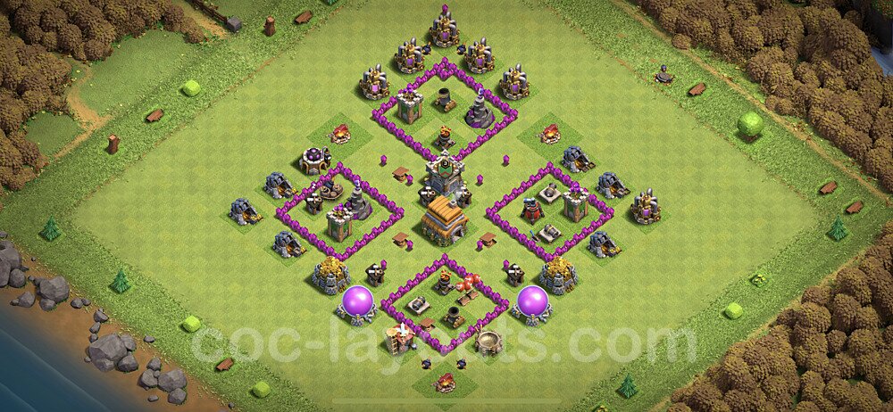 This Town Hall 6 war base is specifically designed to defend against 2-star and 3-star attacks in Clan Wars and Clan War Leagues. The strategic placement of defenses creates multiple compartments that force attackers to use more troops and spells than anticipated. Key defensive structures like Eagle Artillery, Inferno Towers, and X-Bows are positioned to cover crucial sections of the base, making it extremely difficult for opponents to secure a perfect attack. The core of this war base features a centralized Town Hall and Clan Castle, protected by multiple layers of walls and high-damage defenses. This layout forces attackers to commit significant resources just to reach the center, often leaving them without enough firepower to secure the Town Hall destruction. The anti-2-star design ensures that even if attackers breach the outer defenses, they'll struggle to achieve a 50% destruction rating. Air defenses are strategically spread to counter popular air attack strategies like LaLoon (Lava Hound + Balloons) and Electrone (Electro Dragons + Stone Slammer). The symmetrical trap placement and strategic Hidden Tesla positions create deadly surprise elements that can completely derail an attacker's plan. This base has been tested against various meta attack strategies and has consistently proven effective in preventing 3-star attacks.