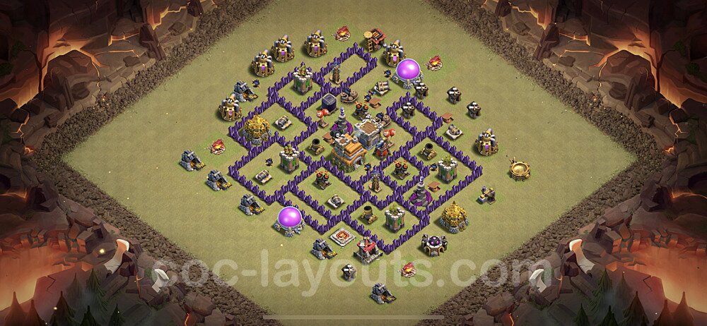 This Town Hall 7 war base is specifically designed to defend against 2-star and 3-star attacks in Clan Wars and Clan War Leagues. The strategic placement of defenses creates multiple compartments that force attackers to use more troops and spells than anticipated. Key defensive structures like Eagle Artillery, Inferno Towers, and X-Bows are positioned to cover crucial sections of the base, making it extremely difficult for opponents to secure a perfect attack. The core of this war base features a centralized Town Hall and Clan Castle, protected by multiple layers of walls and high-damage defenses. This layout forces attackers to commit significant resources just to reach the center, often leaving them without enough firepower to secure the Town Hall destruction. The anti-2-star design ensures that even if attackers breach the outer defenses, they'll struggle to achieve a 50% destruction rating. Air defenses are strategically spread to counter popular air attack strategies like LaLoon (Lava Hound + Balloons) and Electrone (Electro Dragons + Stone Slammer). The symmetrical trap placement and strategic Hidden Tesla positions create deadly surprise elements that can completely derail an attacker's plan. This base has been tested against various meta attack strategies and has consistently proven effective in preventing 3-star attacks.