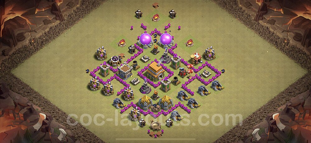 This Town Hall 6 war base is specifically designed to defend against 2-star and 3-star attacks in Clan Wars and Clan War Leagues. The strategic placement of defenses creates multiple compartments that force attackers to use more troops and spells than anticipated. Key defensive structures like Eagle Artillery, Inferno Towers, and X-Bows are positioned to cover crucial sections of the base, making it extremely difficult for opponents to secure a perfect attack. The core of this war base features a centralized Town Hall and Clan Castle, protected by multiple layers of walls and high-damage defenses. This layout forces attackers to commit significant resources just to reach the center, often leaving them without enough firepower to secure the Town Hall destruction. The anti-2-star design ensures that even if attackers breach the outer defenses, they'll struggle to achieve a 50% destruction rating. Air defenses are strategically spread to counter popular air attack strategies like LaLoon (Lava Hound + Balloons) and Electrone (Electro Dragons + Stone Slammer). The symmetrical trap placement and strategic Hidden Tesla positions create deadly surprise elements that can completely derail an attacker's plan. This base has been tested against various meta attack strategies and has consistently proven effective in preventing 3-star attacks.