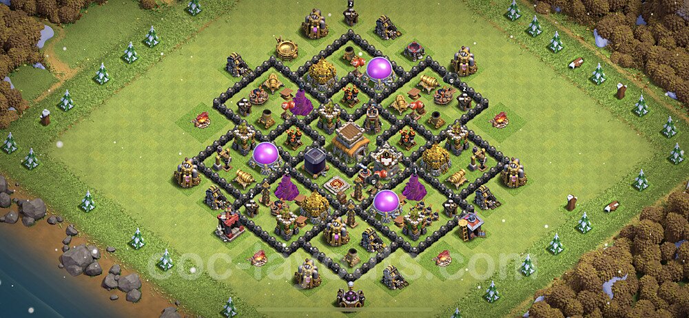 This Town Hall 8 hybrid base offers the best of both worlds - strong resource protection combined with effective trophy defense. The versatile design makes it an excellent choice for players who want to protect their loot while maintaining their trophy count. This balanced approach ensures you don't sacrifice one aspect of defense for another, making it ideal for active players across all league levels. The hybrid layout features centralized resource storages alongside a well-protected Town Hall, with multiple defensive layers that deter both farming raids and trophy pushers. High-value targets are strategically positioned within overlapping defense ranges, forcing attackers to make difficult choices about which objectives to prioritize. The compartmentalized design prevents attackers from easily achieving both loot destruction and the Town Hall kill in a single attack. Defense placement in this hybrid base creates strong coverage against both ground and air attacks. Inferno Towers, X-Bows, and Eagle Artillery work in concert to eliminate threats quickly, while splash damage defenses like Wizard Towers and Bomb Towers counter swarm strategies. The base's funnel-resistant design and strategic trap placement make it effective against popular attack strategies including QC LaLoon (Queen Charge Lava Hound Balloon), Blizzard attacks, and Yeti Smash compositions.
