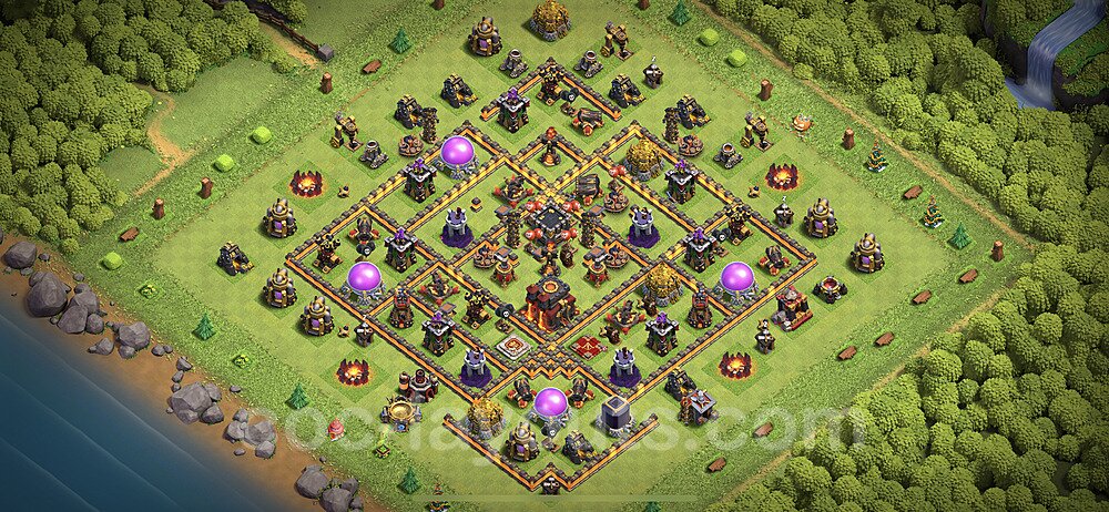 This Town Hall 10 war base is specifically designed to defend against 2-star and 3-star attacks in Clan Wars and Clan War Leagues. The strategic placement of defenses creates multiple compartments that force attackers to use more troops and spells than anticipated. Key defensive structures like Eagle Artillery, Inferno Towers, and X-Bows are positioned to cover crucial sections of the base, making it extremely difficult for opponents to secure a perfect attack. The core of this war base features a centralized Town Hall and Clan Castle, protected by multiple layers of walls and high-damage defenses. This layout forces attackers to commit significant resources just to reach the center, often leaving them without enough firepower to secure the Town Hall destruction. The anti-2-star design ensures that even if attackers breach the outer defenses, they'll struggle to achieve a 50% destruction rating. Air defenses are strategically spread to counter popular air attack strategies like LaLoon (Lava Hound + Balloons) and Electrone (Electro Dragons + Stone Slammer). The symmetrical trap placement and strategic Hidden Tesla positions create deadly surprise elements that can completely derail an attacker's plan. This base has been tested against various meta attack strategies and has consistently proven effective in preventing 3-star attacks.