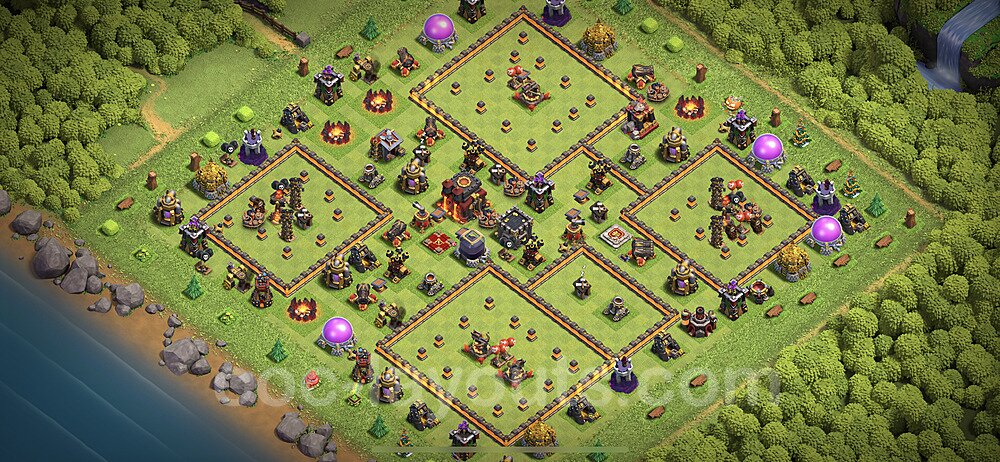 This Town Hall 10 war base is specifically designed to defend against 2-star and 3-star attacks in Clan Wars and Clan War Leagues. The strategic placement of defenses creates multiple compartments that force attackers to use more troops and spells than anticipated. Key defensive structures like Eagle Artillery, Inferno Towers, and X-Bows are positioned to cover crucial sections of the base, making it extremely difficult for opponents to secure a perfect attack. The core of this war base features a centralized Town Hall and Clan Castle, protected by multiple layers of walls and high-damage defenses. This layout forces attackers to commit significant resources just to reach the center, often leaving them without enough firepower to secure the Town Hall destruction. The anti-2-star design ensures that even if attackers breach the outer defenses, they'll struggle to achieve a 50% destruction rating. Air defenses are strategically spread to counter popular air attack strategies like LaLoon (Lava Hound + Balloons) and Electrone (Electro Dragons + Stone Slammer). The symmetrical trap placement and strategic Hidden Tesla positions create deadly surprise elements that can completely derail an attacker's plan. This base has been tested against various meta attack strategies and has consistently proven effective in preventing 3-star attacks.
