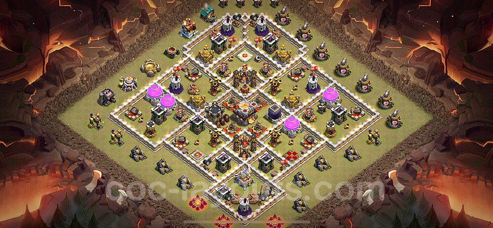 This Town Hall 11 war base is specifically designed to defend against 2-star and 3-star attacks in Clan Wars and Clan War Leagues. The strategic placement of defenses creates multiple compartments that force attackers to use more troops and spells than anticipated. Key defensive structures like Eagle Artillery, Inferno Towers, and X-Bows are positioned to cover crucial sections of the base, making it extremely difficult for opponents to secure a perfect attack. The core of this war base features a centralized Town Hall and Clan Castle, protected by multiple layers of walls and high-damage defenses. This layout forces attackers to commit significant resources just to reach the center, often leaving them without enough firepower to secure the Town Hall destruction. The anti-2-star design ensures that even if attackers breach the outer defenses, they'll struggle to achieve a 50% destruction rating. Air defenses are strategically spread to counter popular air attack strategies like LaLoon (Lava Hound + Balloons) and Electrone (Electro Dragons + Stone Slammer). The symmetrical trap placement and strategic Hidden Tesla positions create deadly surprise elements that can completely derail an attacker's plan. This base has been tested against various meta attack strategies and has consistently proven effective in preventing 3-star attacks.
