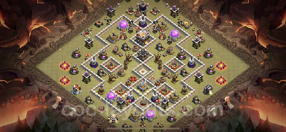 This Town Hall 11 war base is specifically designed to defend against 2-star and 3-star attacks in Clan Wars and Clan War Leagues. The strategic placement of defenses creates multiple compartments that force attackers to use more troops and spells than anticipated. Key defensive structures like Eagle Artillery, Inferno Towers, and X-Bows are positioned to cover crucial sections of the base, making it extremely difficult for opponents to secure a perfect attack. The core of this war base features a centralized Town Hall and Clan Castle, protected by multiple layers of walls and high-damage defenses. This layout forces attackers to commit significant resources just to reach the center, often leaving them without enough firepower to secure the Town Hall destruction. The anti-2-star design ensures that even if attackers breach the outer defenses, they'll struggle to achieve a 50% destruction rating. Air defenses are strategically spread to counter popular air attack strategies like LaLoon (Lava Hound + Balloons) and Electrone (Electro Dragons + Stone Slammer). The symmetrical trap placement and strategic Hidden Tesla positions create deadly surprise elements that can completely derail an attacker's plan. This base has been tested against various meta attack strategies and has consistently proven effective in preventing 3-star attacks.