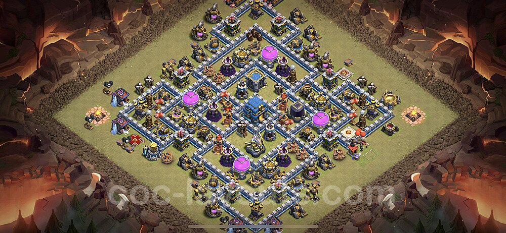This Town Hall 12 war base is specifically designed to defend against 2-star and 3-star attacks in Clan Wars and Clan War Leagues. The strategic placement of defenses creates multiple compartments that force attackers to use more troops and spells than anticipated. Key defensive structures like Eagle Artillery, Inferno Towers, and X-Bows are positioned to cover crucial sections of the base, making it extremely difficult for opponents to secure a perfect attack. The core of this war base features a centralized Town Hall and Clan Castle, protected by multiple layers of walls and high-damage defenses. This layout forces attackers to commit significant resources just to reach the center, often leaving them without enough firepower to secure the Town Hall destruction. The anti-2-star design ensures that even if attackers breach the outer defenses, they'll struggle to achieve a 50% destruction rating. Air defenses are strategically spread to counter popular air attack strategies like LaLoon (Lava Hound + Balloons) and Electrone (Electro Dragons + Stone Slammer). The symmetrical trap placement and strategic Hidden Tesla positions create deadly surprise elements that can completely derail an attacker's plan. This base has been tested against various meta attack strategies and has consistently proven effective in preventing 3-star attacks.