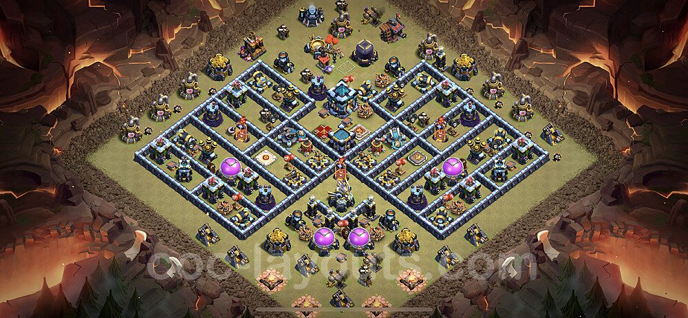 This Town Hall 13 war base is specifically designed to defend against 2-star and 3-star attacks in Clan Wars and Clan War Leagues. The strategic placement of defenses creates multiple compartments that force attackers to use more troops and spells than anticipated. Key defensive structures like Eagle Artillery, Inferno Towers, and X-Bows are positioned to cover crucial sections of the base, making it extremely difficult for opponents to secure a perfect attack. The core of this war base features a centralized Town Hall and Clan Castle, protected by multiple layers of walls and high-damage defenses. This layout forces attackers to commit significant resources just to reach the center, often leaving them without enough firepower to secure the Town Hall destruction. The anti-2-star design ensures that even if attackers breach the outer defenses, they'll struggle to achieve a 50% destruction rating. Air defenses are strategically spread to counter popular air attack strategies like LaLoon (Lava Hound + Balloons) and Electrone (Electro Dragons + Stone Slammer). The symmetrical trap placement and strategic Hidden Tesla positions create deadly surprise elements that can completely derail an attacker's plan. This base has been tested against various meta attack strategies and has consistently proven effective in preventing 3-star attacks.