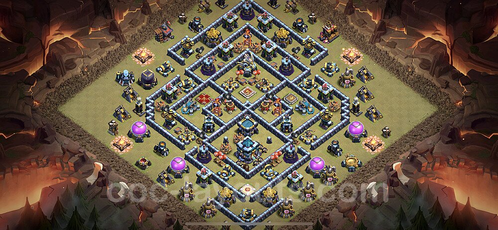 This Town Hall 13 war base is specifically designed to defend against 2-star and 3-star attacks in Clan Wars and Clan War Leagues. The strategic placement of defenses creates multiple compartments that force attackers to use more troops and spells than anticipated. Key defensive structures like Eagle Artillery, Inferno Towers, and X-Bows are positioned to cover crucial sections of the base, making it extremely difficult for opponents to secure a perfect attack. The core of this war base features a centralized Town Hall and Clan Castle, protected by multiple layers of walls and high-damage defenses. This layout forces attackers to commit significant resources just to reach the center, often leaving them without enough firepower to secure the Town Hall destruction. The anti-2-star design ensures that even if attackers breach the outer defenses, they'll struggle to achieve a 50% destruction rating. Air defenses are strategically spread to counter popular air attack strategies like LaLoon (Lava Hound + Balloons) and Electrone (Electro Dragons + Stone Slammer). The symmetrical trap placement and strategic Hidden Tesla positions create deadly surprise elements that can completely derail an attacker's plan. This base has been tested against various meta attack strategies and has consistently proven effective in preventing 3-star attacks.