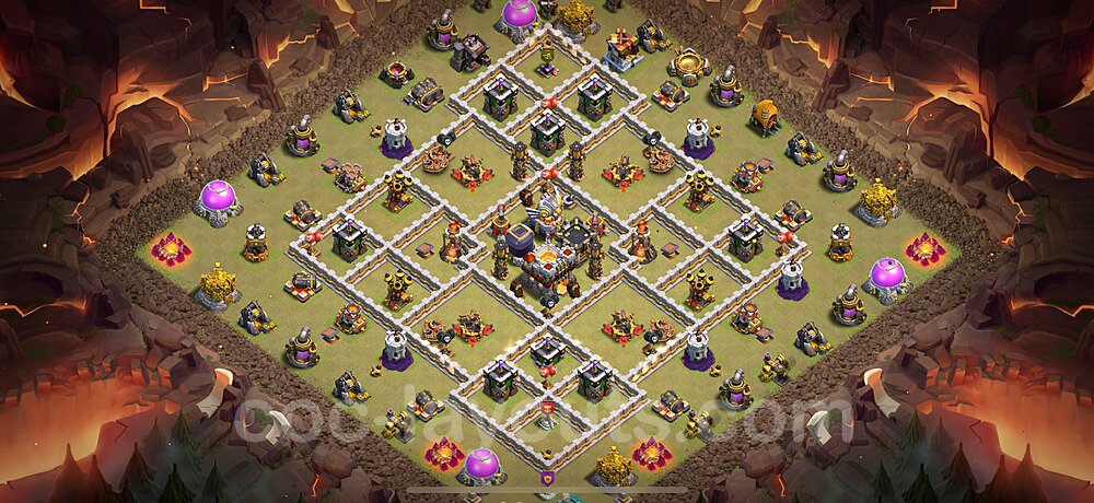 This Town Hall 11 war base is specifically designed to defend against 2-star and 3-star attacks in Clan Wars and Clan War Leagues. The strategic placement of defenses creates multiple compartments that force attackers to use more troops and spells than anticipated. Key defensive structures like Eagle Artillery, Inferno Towers, and X-Bows are positioned to cover crucial sections of the base, making it extremely difficult for opponents to secure a perfect attack. The core of this war base features a centralized Town Hall and Clan Castle, protected by multiple layers of walls and high-damage defenses. This layout forces attackers to commit significant resources just to reach the center, often leaving them without enough firepower to secure the Town Hall destruction. The anti-2-star design ensures that even if attackers breach the outer defenses, they'll struggle to achieve a 50% destruction rating. Air defenses are strategically spread to counter popular air attack strategies like LaLoon (Lava Hound + Balloons) and Electrone (Electro Dragons + Stone Slammer). The symmetrical trap placement and strategic Hidden Tesla positions create deadly surprise elements that can completely derail an attacker's plan. This base has been tested against various meta attack strategies and has consistently proven effective in preventing 3-star attacks.