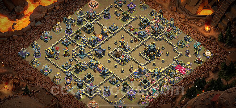 This Town Hall 17 war base is specifically designed to defend against 2-star and 3-star attacks in Clan Wars and Clan War Leagues. The strategic placement of defenses creates multiple compartments that force attackers to use more troops and spells than anticipated. Key defensive structures like Eagle Artillery, Inferno Towers, and X-Bows are positioned to cover crucial sections of the base, making it extremely difficult for opponents to secure a perfect attack. The core of this war base features a centralized Town Hall and Clan Castle, protected by multiple layers of walls and high-damage defenses. This layout forces attackers to commit significant resources just to reach the center, often leaving them without enough firepower to secure the Town Hall destruction. The anti-2-star design ensures that even if attackers breach the outer defenses, they'll struggle to achieve a 50% destruction rating. Air defenses are strategically spread to counter popular air attack strategies like LaLoon (Lava Hound + Balloons) and Electrone (Electro Dragons + Stone Slammer). The symmetrical trap placement and strategic Hidden Tesla positions create deadly surprise elements that can completely derail an attacker's plan. This base has been tested against various meta attack strategies and has consistently proven effective in preventing 3-star attacks.