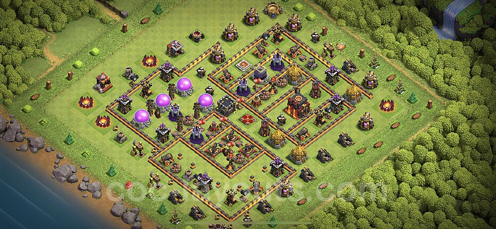 This Town Hall 10 hybrid base offers the best of both worlds - strong resource protection combined with effective trophy defense. The versatile design makes it an excellent choice for players who want to protect their loot while maintaining their trophy count. This balanced approach ensures you don't sacrifice one aspect of defense for another, making it ideal for active players across all league levels. The hybrid layout features centralized resource storages alongside a well-protected Town Hall, with multiple defensive layers that deter both farming raids and trophy pushers. High-value targets are strategically positioned within overlapping defense ranges, forcing attackers to make difficult choices about which objectives to prioritize. The compartmentalized design prevents attackers from easily achieving both loot destruction and the Town Hall kill in a single attack. Defense placement in this hybrid base creates strong coverage against both ground and air attacks. Inferno Towers, X-Bows, and Eagle Artillery work in concert to eliminate threats quickly, while splash damage defenses like Wizard Towers and Bomb Towers counter swarm strategies. The base's funnel-resistant design and strategic trap placement make it effective against popular attack strategies including QC LaLoon (Queen Charge Lava Hound Balloon), Blizzard attacks, and Yeti Smash compositions.