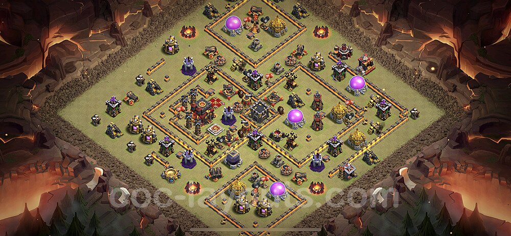 This Town Hall 10 war base is specifically designed to defend against 2-star and 3-star attacks in Clan Wars and Clan War Leagues. The strategic placement of defenses creates multiple compartments that force attackers to use more troops and spells than anticipated. Key defensive structures like Eagle Artillery, Inferno Towers, and X-Bows are positioned to cover crucial sections of the base, making it extremely difficult for opponents to secure a perfect attack. The core of this war base features a centralized Town Hall and Clan Castle, protected by multiple layers of walls and high-damage defenses. This layout forces attackers to commit significant resources just to reach the center, often leaving them without enough firepower to secure the Town Hall destruction. The anti-2-star design ensures that even if attackers breach the outer defenses, they'll struggle to achieve a 50% destruction rating. Air defenses are strategically spread to counter popular air attack strategies like LaLoon (Lava Hound + Balloons) and Electrone (Electro Dragons + Stone Slammer). The symmetrical trap placement and strategic Hidden Tesla positions create deadly surprise elements that can completely derail an attacker's plan. This base has been tested against various meta attack strategies and has consistently proven effective in preventing 3-star attacks.