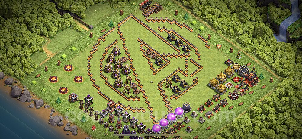 This Town Hall 10 war base is specifically designed to defend against 2-star and 3-star attacks in Clan Wars and Clan War Leagues. The strategic placement of defenses creates multiple compartments that force attackers to use more troops and spells than anticipated. Key defensive structures like Eagle Artillery, Inferno Towers, and X-Bows are positioned to cover crucial sections of the base, making it extremely difficult for opponents to secure a perfect attack. The core of this war base features a centralized Town Hall and Clan Castle, protected by multiple layers of walls and high-damage defenses. This layout forces attackers to commit significant resources just to reach the center, often leaving them without enough firepower to secure the Town Hall destruction. The anti-2-star design ensures that even if attackers breach the outer defenses, they'll struggle to achieve a 50% destruction rating. Air defenses are strategically spread to counter popular air attack strategies like LaLoon (Lava Hound + Balloons) and Electrone (Electro Dragons + Stone Slammer). The symmetrical trap placement and strategic Hidden Tesla positions create deadly surprise elements that can completely derail an attacker's plan. This base has been tested against various meta attack strategies and has consistently proven effective in preventing 3-star attacks.