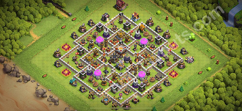 This Town Hall 11 farming base is optimized to protect your resources including Gold, Elixir, and Dark Elixir from raiders. The layout features centralized storages with multiple compartments that make it extremely difficult for attackers to steal large amounts of resources in a single raid. This design philosophy prioritizes resource protection over trophies, making it ideal for players focused on upgrading their village. The strategic placement of resource storages ensures they are well-protected by high-damage defenses like X-Bows, Inferno Towers, and Eagle Artillery. Each storage is surrounded by multiple wall layers and defensive structures, forcing attackers to invest heavily in troops and spells to reach your loot. The farming base design also incorporates strategic dead zones where attackers' troops tend to path inefficiently, wasting time and taking heavy damage from nearby defenses. Collectors and mines are positioned on the outer edges as "bait" while your main storages remain heavily protected in the core. This layout has proven effective against common farming strategies like BARCH (Barbarians + Archers), GoWiPe (Golems + Wizards + Pekka), and mass Miner attacks. The compartmentalized design prevents attackers from funneling straight to your resources, ensuring you maintain your hard-earned loot for important upgrades.