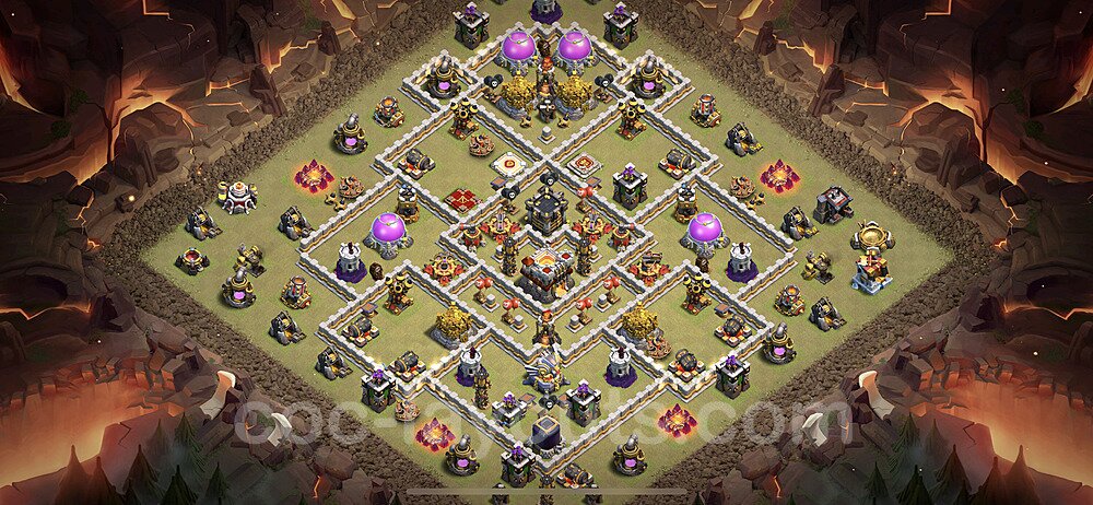 This Town Hall 11 hybrid base offers the best of both worlds - strong resource protection combined with effective trophy defense. The versatile design makes it an excellent choice for players who want to protect their loot while maintaining their trophy count. This balanced approach ensures you don't sacrifice one aspect of defense for another, making it ideal for active players across all league levels. The hybrid layout features centralized resource storages alongside a well-protected Town Hall, with multiple defensive layers that deter both farming raids and trophy pushers. High-value targets are strategically positioned within overlapping defense ranges, forcing attackers to make difficult choices about which objectives to prioritize. The compartmentalized design prevents attackers from easily achieving both loot destruction and the Town Hall kill in a single attack. Defense placement in this hybrid base creates strong coverage against both ground and air attacks. Inferno Towers, X-Bows, and Eagle Artillery work in concert to eliminate threats quickly, while splash damage defenses like Wizard Towers and Bomb Towers counter swarm strategies. The base's funnel-resistant design and strategic trap placement make it effective against popular attack strategies including QC LaLoon (Queen Charge Lava Hound Balloon), Blizzard attacks, and Yeti Smash compositions.
