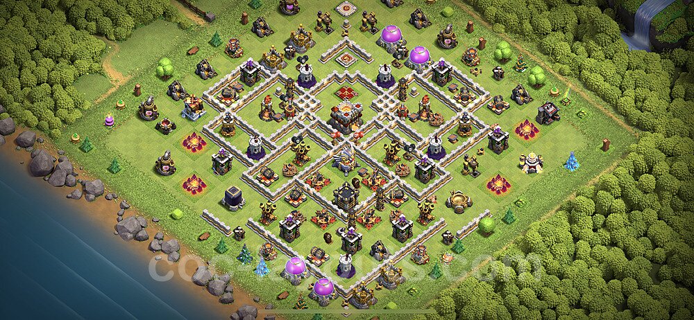 This Town Hall 11 war base is specifically designed to defend against 2-star and 3-star attacks in Clan Wars and Clan War Leagues. The strategic placement of defenses creates multiple compartments that force attackers to use more troops and spells than anticipated. Key defensive structures like Eagle Artillery, Inferno Towers, and X-Bows are positioned to cover crucial sections of the base, making it extremely difficult for opponents to secure a perfect attack. The core of this war base features a centralized Town Hall and Clan Castle, protected by multiple layers of walls and high-damage defenses. This layout forces attackers to commit significant resources just to reach the center, often leaving them without enough firepower to secure the Town Hall destruction. The anti-2-star design ensures that even if attackers breach the outer defenses, they'll struggle to achieve a 50% destruction rating. Air defenses are strategically spread to counter popular air attack strategies like LaLoon (Lava Hound + Balloons) and Electrone (Electro Dragons + Stone Slammer). The symmetrical trap placement and strategic Hidden Tesla positions create deadly surprise elements that can completely derail an attacker's plan. This base has been tested against various meta attack strategies and has consistently proven effective in preventing 3-star attacks.