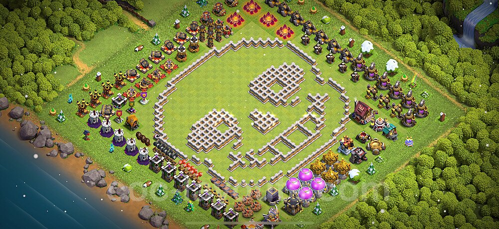 This Town Hall 11 war base is specifically designed to defend against 2-star and 3-star attacks in Clan Wars and Clan War Leagues. The strategic placement of defenses creates multiple compartments that force attackers to use more troops and spells than anticipated. Key defensive structures like Eagle Artillery, Inferno Towers, and X-Bows are positioned to cover crucial sections of the base, making it extremely difficult for opponents to secure a perfect attack. The core of this war base features a centralized Town Hall and Clan Castle, protected by multiple layers of walls and high-damage defenses. This layout forces attackers to commit significant resources just to reach the center, often leaving them without enough firepower to secure the Town Hall destruction. The anti-2-star design ensures that even if attackers breach the outer defenses, they'll struggle to achieve a 50% destruction rating. Air defenses are strategically spread to counter popular air attack strategies like LaLoon (Lava Hound + Balloons) and Electrone (Electro Dragons + Stone Slammer). The symmetrical trap placement and strategic Hidden Tesla positions create deadly surprise elements that can completely derail an attacker's plan. This base has been tested against various meta attack strategies and has consistently proven effective in preventing 3-star attacks.