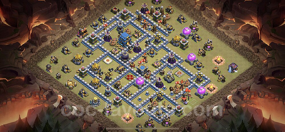 This Town Hall 12 war base is specifically designed to defend against 2-star and 3-star attacks in Clan Wars and Clan War Leagues. The strategic placement of defenses creates multiple compartments that force attackers to use more troops and spells than anticipated. Key defensive structures like Eagle Artillery, Inferno Towers, and X-Bows are positioned to cover crucial sections of the base, making it extremely difficult for opponents to secure a perfect attack. The core of this war base features a centralized Town Hall and Clan Castle, protected by multiple layers of walls and high-damage defenses. This layout forces attackers to commit significant resources just to reach the center, often leaving them without enough firepower to secure the Town Hall destruction. The anti-2-star design ensures that even if attackers breach the outer defenses, they'll struggle to achieve a 50% destruction rating. Air defenses are strategically spread to counter popular air attack strategies like LaLoon (Lava Hound + Balloons) and Electrone (Electro Dragons + Stone Slammer). The symmetrical trap placement and strategic Hidden Tesla positions create deadly surprise elements that can completely derail an attacker's plan. This base has been tested against various meta attack strategies and has consistently proven effective in preventing 3-star attacks.