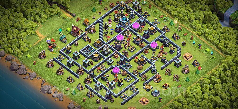 This Town Hall 13 farming base is optimized to protect your resources including Gold, Elixir, and Dark Elixir from raiders. The layout features centralized storages with multiple compartments that make it extremely difficult for attackers to steal large amounts of resources in a single raid. This design philosophy prioritizes resource protection over trophies, making it ideal for players focused on upgrading their village. The strategic placement of resource storages ensures they are well-protected by high-damage defenses like X-Bows, Inferno Towers, and Eagle Artillery. Each storage is surrounded by multiple wall layers and defensive structures, forcing attackers to invest heavily in troops and spells to reach your loot. The farming base design also incorporates strategic dead zones where attackers' troops tend to path inefficiently, wasting time and taking heavy damage from nearby defenses. Collectors and mines are positioned on the outer edges as "bait" while your main storages remain heavily protected in the core. This layout has proven effective against common farming strategies like BARCH (Barbarians + Archers), GoWiPe (Golems + Wizards + Pekka), and mass Miner attacks. The compartmentalized design prevents attackers from funneling straight to your resources, ensuring you maintain your hard-earned loot for important upgrades.
