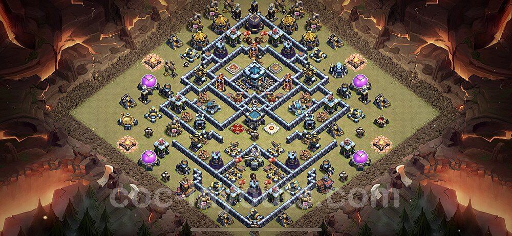 This Town Hall 13 war base is specifically designed to defend against 2-star and 3-star attacks in Clan Wars and Clan War Leagues. The strategic placement of defenses creates multiple compartments that force attackers to use more troops and spells than anticipated. Key defensive structures like Eagle Artillery, Inferno Towers, and X-Bows are positioned to cover crucial sections of the base, making it extremely difficult for opponents to secure a perfect attack. The core of this war base features a centralized Town Hall and Clan Castle, protected by multiple layers of walls and high-damage defenses. This layout forces attackers to commit significant resources just to reach the center, often leaving them without enough firepower to secure the Town Hall destruction. The anti-2-star design ensures that even if attackers breach the outer defenses, they'll struggle to achieve a 50% destruction rating. Air defenses are strategically spread to counter popular air attack strategies like LaLoon (Lava Hound + Balloons) and Electrone (Electro Dragons + Stone Slammer). The symmetrical trap placement and strategic Hidden Tesla positions create deadly surprise elements that can completely derail an attacker's plan. This base has been tested against various meta attack strategies and has consistently proven effective in preventing 3-star attacks.