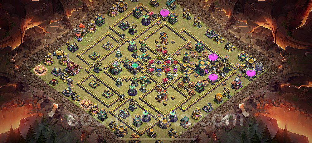 This Town Hall 14 war base is specifically designed to defend against 2-star and 3-star attacks in Clan Wars and Clan War Leagues. The strategic placement of defenses creates multiple compartments that force attackers to use more troops and spells than anticipated. Key defensive structures like Eagle Artillery, Inferno Towers, and X-Bows are positioned to cover crucial sections of the base, making it extremely difficult for opponents to secure a perfect attack. The core of this war base features a centralized Town Hall and Clan Castle, protected by multiple layers of walls and high-damage defenses. This layout forces attackers to commit significant resources just to reach the center, often leaving them without enough firepower to secure the Town Hall destruction. The anti-2-star design ensures that even if attackers breach the outer defenses, they'll struggle to achieve a 50% destruction rating. Air defenses are strategically spread to counter popular air attack strategies like LaLoon (Lava Hound + Balloons) and Electrone (Electro Dragons + Stone Slammer). The symmetrical trap placement and strategic Hidden Tesla positions create deadly surprise elements that can completely derail an attacker's plan. This base has been tested against various meta attack strategies and has consistently proven effective in preventing 3-star attacks.