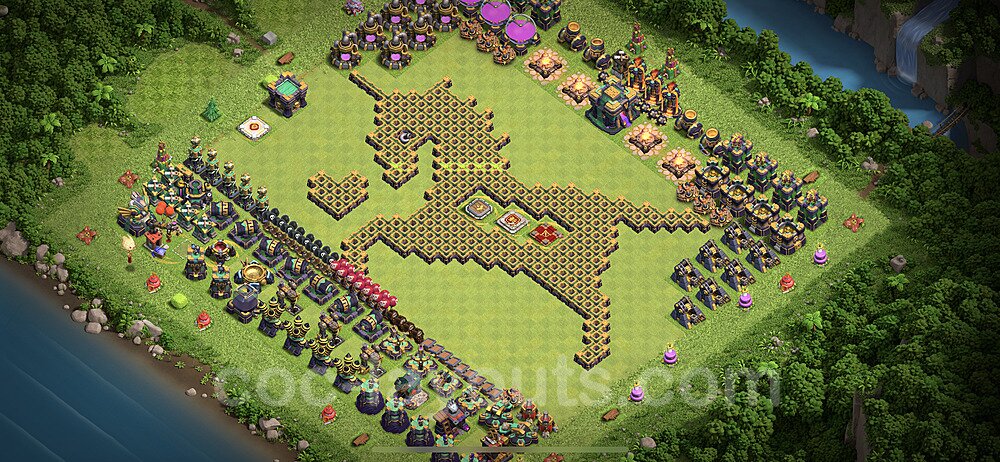 This Town Hall 14 war base is specifically designed to defend against 2-star and 3-star attacks in Clan Wars and Clan War Leagues. The strategic placement of defenses creates multiple compartments that force attackers to use more troops and spells than anticipated. Key defensive structures like Eagle Artillery, Inferno Towers, and X-Bows are positioned to cover crucial sections of the base, making it extremely difficult for opponents to secure a perfect attack. The core of this war base features a centralized Town Hall and Clan Castle, protected by multiple layers of walls and high-damage defenses. This layout forces attackers to commit significant resources just to reach the center, often leaving them without enough firepower to secure the Town Hall destruction. The anti-2-star design ensures that even if attackers breach the outer defenses, they'll struggle to achieve a 50% destruction rating. Air defenses are strategically spread to counter popular air attack strategies like LaLoon (Lava Hound + Balloons) and Electrone (Electro Dragons + Stone Slammer). The symmetrical trap placement and strategic Hidden Tesla positions create deadly surprise elements that can completely derail an attacker's plan. This base has been tested against various meta attack strategies and has consistently proven effective in preventing 3-star attacks.