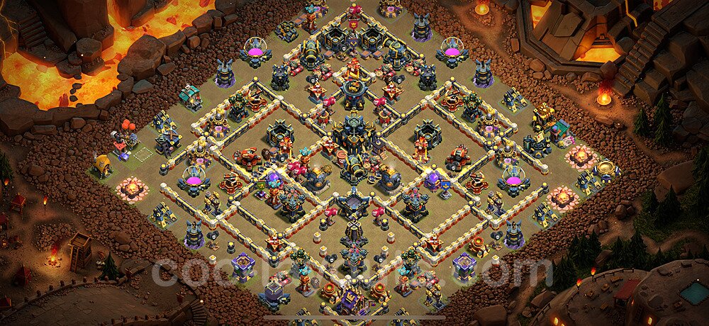 This Town Hall 17 war base is specifically designed to defend against 2-star and 3-star attacks in Clan Wars and Clan War Leagues. The strategic placement of defenses creates multiple compartments that force attackers to use more troops and spells than anticipated. Key defensive structures like Eagle Artillery, Inferno Towers, and X-Bows are positioned to cover crucial sections of the base, making it extremely difficult for opponents to secure a perfect attack. The core of this war base features a centralized Town Hall and Clan Castle, protected by multiple layers of walls and high-damage defenses. This layout forces attackers to commit significant resources just to reach the center, often leaving them without enough firepower to secure the Town Hall destruction. The anti-2-star design ensures that even if attackers breach the outer defenses, they'll struggle to achieve a 50% destruction rating. Air defenses are strategically spread to counter popular air attack strategies like LaLoon (Lava Hound + Balloons) and Electrone (Electro Dragons + Stone Slammer). The symmetrical trap placement and strategic Hidden Tesla positions create deadly surprise elements that can completely derail an attacker's plan. This base has been tested against various meta attack strategies and has consistently proven effective in preventing 3-star attacks.