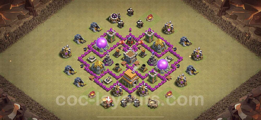 This Town Hall 6 hybrid base offers the best of both worlds - strong resource protection combined with effective trophy defense. The versatile design makes it an excellent choice for players who want to protect their loot while maintaining their trophy count. This balanced approach ensures you don't sacrifice one aspect of defense for another, making it ideal for active players across all league levels. The hybrid layout features centralized resource storages alongside a well-protected Town Hall, with multiple defensive layers that deter both farming raids and trophy pushers. High-value targets are strategically positioned within overlapping defense ranges, forcing attackers to make difficult choices about which objectives to prioritize. The compartmentalized design prevents attackers from easily achieving both loot destruction and the Town Hall kill in a single attack. Defense placement in this hybrid base creates strong coverage against both ground and air attacks. Inferno Towers, X-Bows, and Eagle Artillery work in concert to eliminate threats quickly, while splash damage defenses like Wizard Towers and Bomb Towers counter swarm strategies. The base's funnel-resistant design and strategic trap placement make it effective against popular attack strategies including QC LaLoon (Queen Charge Lava Hound Balloon), Blizzard attacks, and Yeti Smash compositions.