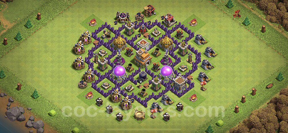 This Town Hall 7 hybrid base offers the best of both worlds - strong resource protection combined with effective trophy defense. The versatile design makes it an excellent choice for players who want to protect their loot while maintaining their trophy count. This balanced approach ensures you don't sacrifice one aspect of defense for another, making it ideal for active players across all league levels. The hybrid layout features centralized resource storages alongside a well-protected Town Hall, with multiple defensive layers that deter both farming raids and trophy pushers. High-value targets are strategically positioned within overlapping defense ranges, forcing attackers to make difficult choices about which objectives to prioritize. The compartmentalized design prevents attackers from easily achieving both loot destruction and the Town Hall kill in a single attack. Defense placement in this hybrid base creates strong coverage against both ground and air attacks. Inferno Towers, X-Bows, and Eagle Artillery work in concert to eliminate threats quickly, while splash damage defenses like Wizard Towers and Bomb Towers counter swarm strategies. The base's funnel-resistant design and strategic trap placement make it effective against popular attack strategies including QC LaLoon (Queen Charge Lava Hound Balloon), Blizzard attacks, and Yeti Smash compositions.
