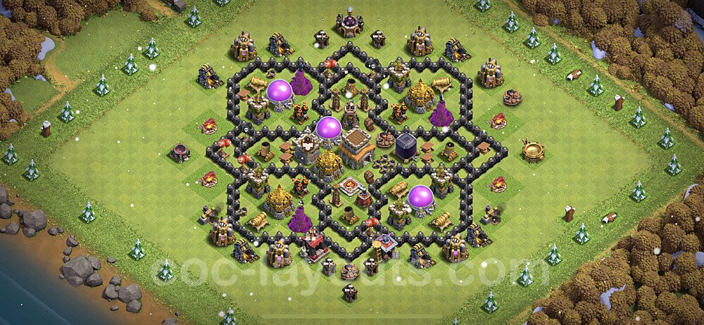 This Town Hall 8 farming base is optimized to protect your resources including Gold, Elixir, and Dark Elixir from raiders. The layout features centralized storages with multiple compartments that make it extremely difficult for attackers to steal large amounts of resources in a single raid. This design philosophy prioritizes resource protection over trophies, making it ideal for players focused on upgrading their village. The strategic placement of resource storages ensures they are well-protected by high-damage defenses like X-Bows, Inferno Towers, and Eagle Artillery. Each storage is surrounded by multiple wall layers and defensive structures, forcing attackers to invest heavily in troops and spells to reach your loot. The farming base design also incorporates strategic dead zones where attackers' troops tend to path inefficiently, wasting time and taking heavy damage from nearby defenses. Collectors and mines are positioned on the outer edges as "bait" while your main storages remain heavily protected in the core. This layout has proven effective against common farming strategies like BARCH (Barbarians + Archers), GoWiPe (Golems + Wizards + Pekka), and mass Miner attacks. The compartmentalized design prevents attackers from funneling straight to your resources, ensuring you maintain your hard-earned loot for important upgrades.