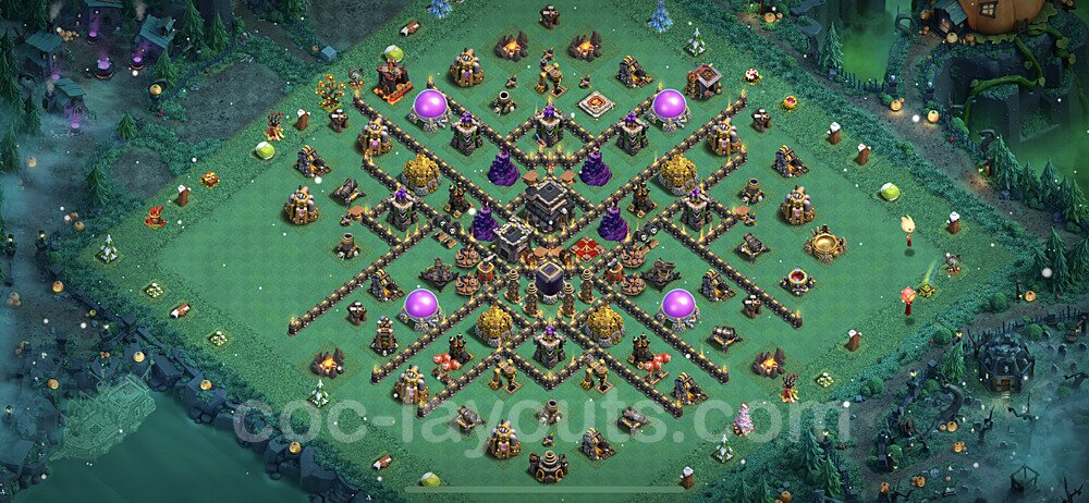 This Town Hall 9 hybrid base offers the best of both worlds - strong resource protection combined with effective trophy defense. The versatile design makes it an excellent choice for players who want to protect their loot while maintaining their trophy count. This balanced approach ensures you don't sacrifice one aspect of defense for another, making it ideal for active players across all league levels. The hybrid layout features centralized resource storages alongside a well-protected Town Hall, with multiple defensive layers that deter both farming raids and trophy pushers. High-value targets are strategically positioned within overlapping defense ranges, forcing attackers to make difficult choices about which objectives to prioritize. The compartmentalized design prevents attackers from easily achieving both loot destruction and the Town Hall kill in a single attack. Defense placement in this hybrid base creates strong coverage against both ground and air attacks. Inferno Towers, X-Bows, and Eagle Artillery work in concert to eliminate threats quickly, while splash damage defenses like Wizard Towers and Bomb Towers counter swarm strategies. The base's funnel-resistant design and strategic trap placement make it effective against popular attack strategies including QC LaLoon (Queen Charge Lava Hound Balloon), Blizzard attacks, and Yeti Smash compositions.