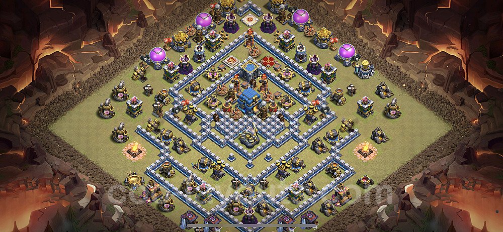 This Town Hall 12 war base is specifically designed to defend against 2-star and 3-star attacks in Clan Wars and Clan War Leagues. The strategic placement of defenses creates multiple compartments that force attackers to use more troops and spells than anticipated. Key defensive structures like Eagle Artillery, Inferno Towers, and X-Bows are positioned to cover crucial sections of the base, making it extremely difficult for opponents to secure a perfect attack. The core of this war base features a centralized Town Hall and Clan Castle, protected by multiple layers of walls and high-damage defenses. This layout forces attackers to commit significant resources just to reach the center, often leaving them without enough firepower to secure the Town Hall destruction. The anti-2-star design ensures that even if attackers breach the outer defenses, they'll struggle to achieve a 50% destruction rating. Air defenses are strategically spread to counter popular air attack strategies like LaLoon (Lava Hound + Balloons) and Electrone (Electro Dragons + Stone Slammer). The symmetrical trap placement and strategic Hidden Tesla positions create deadly surprise elements that can completely derail an attacker's plan. This base has been tested against various meta attack strategies and has consistently proven effective in preventing 3-star attacks.