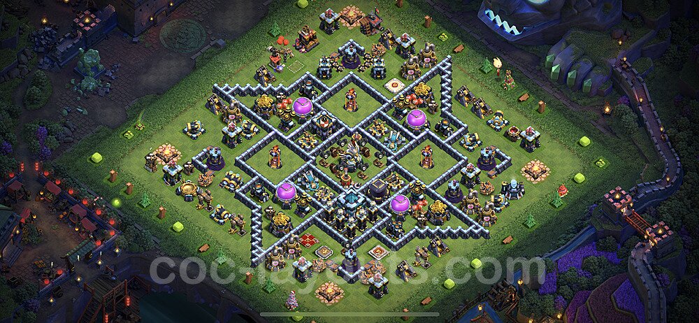 This Town Hall 13 farming base is optimized to protect your resources including Gold, Elixir, and Dark Elixir from raiders. The layout features centralized storages with multiple compartments that make it extremely difficult for attackers to steal large amounts of resources in a single raid. This design philosophy prioritizes resource protection over trophies, making it ideal for players focused on upgrading their village. The strategic placement of resource storages ensures they are well-protected by high-damage defenses like X-Bows, Inferno Towers, and Eagle Artillery. Each storage is surrounded by multiple wall layers and defensive structures, forcing attackers to invest heavily in troops and spells to reach your loot. The farming base design also incorporates strategic dead zones where attackers' troops tend to path inefficiently, wasting time and taking heavy damage from nearby defenses. Collectors and mines are positioned on the outer edges as "bait" while your main storages remain heavily protected in the core. This layout has proven effective against common farming strategies like BARCH (Barbarians + Archers), GoWiPe (Golems + Wizards + Pekka), and mass Miner attacks. The compartmentalized design prevents attackers from funneling straight to your resources, ensuring you maintain your hard-earned loot for important upgrades.