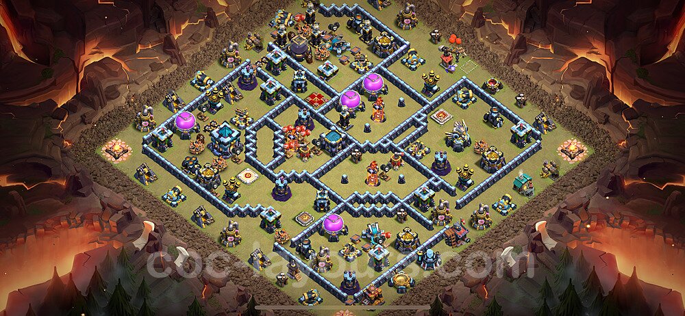 This Town Hall 13 hybrid base offers the best of both worlds - strong resource protection combined with effective trophy defense. The versatile design makes it an excellent choice for players who want to protect their loot while maintaining their trophy count. This balanced approach ensures you don't sacrifice one aspect of defense for another, making it ideal for active players across all league levels. The hybrid layout features centralized resource storages alongside a well-protected Town Hall, with multiple defensive layers that deter both farming raids and trophy pushers. High-value targets are strategically positioned within overlapping defense ranges, forcing attackers to make difficult choices about which objectives to prioritize. The compartmentalized design prevents attackers from easily achieving both loot destruction and the Town Hall kill in a single attack. Defense placement in this hybrid base creates strong coverage against both ground and air attacks. Inferno Towers, X-Bows, and Eagle Artillery work in concert to eliminate threats quickly, while splash damage defenses like Wizard Towers and Bomb Towers counter swarm strategies. The base's funnel-resistant design and strategic trap placement make it effective against popular attack strategies including QC LaLoon (Queen Charge Lava Hound Balloon), Blizzard attacks, and Yeti Smash compositions.