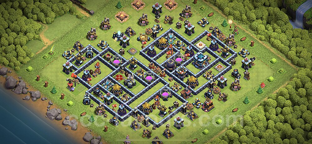 This Town Hall 13 hybrid base offers the best of both worlds - strong resource protection combined with effective trophy defense. The versatile design makes it an excellent choice for players who want to protect their loot while maintaining their trophy count. This balanced approach ensures you don't sacrifice one aspect of defense for another, making it ideal for active players across all league levels. The hybrid layout features centralized resource storages alongside a well-protected Town Hall, with multiple defensive layers that deter both farming raids and trophy pushers. High-value targets are strategically positioned within overlapping defense ranges, forcing attackers to make difficult choices about which objectives to prioritize. The compartmentalized design prevents attackers from easily achieving both loot destruction and the Town Hall kill in a single attack. Defense placement in this hybrid base creates strong coverage against both ground and air attacks. Inferno Towers, X-Bows, and Eagle Artillery work in concert to eliminate threats quickly, while splash damage defenses like Wizard Towers and Bomb Towers counter swarm strategies. The base's funnel-resistant design and strategic trap placement make it effective against popular attack strategies including QC LaLoon (Queen Charge Lava Hound Balloon), Blizzard attacks, and Yeti Smash compositions.