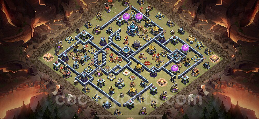 This Town Hall 13 hybrid base offers the best of both worlds - strong resource protection combined with effective trophy defense. The versatile design makes it an excellent choice for players who want to protect their loot while maintaining their trophy count. This balanced approach ensures you don't sacrifice one aspect of defense for another, making it ideal for active players across all league levels. The hybrid layout features centralized resource storages alongside a well-protected Town Hall, with multiple defensive layers that deter both farming raids and trophy pushers. High-value targets are strategically positioned within overlapping defense ranges, forcing attackers to make difficult choices about which objectives to prioritize. The compartmentalized design prevents attackers from easily achieving both loot destruction and the Town Hall kill in a single attack. Defense placement in this hybrid base creates strong coverage against both ground and air attacks. Inferno Towers, X-Bows, and Eagle Artillery work in concert to eliminate threats quickly, while splash damage defenses like Wizard Towers and Bomb Towers counter swarm strategies. The base's funnel-resistant design and strategic trap placement make it effective against popular attack strategies including QC LaLoon (Queen Charge Lava Hound Balloon), Blizzard attacks, and Yeti Smash compositions.