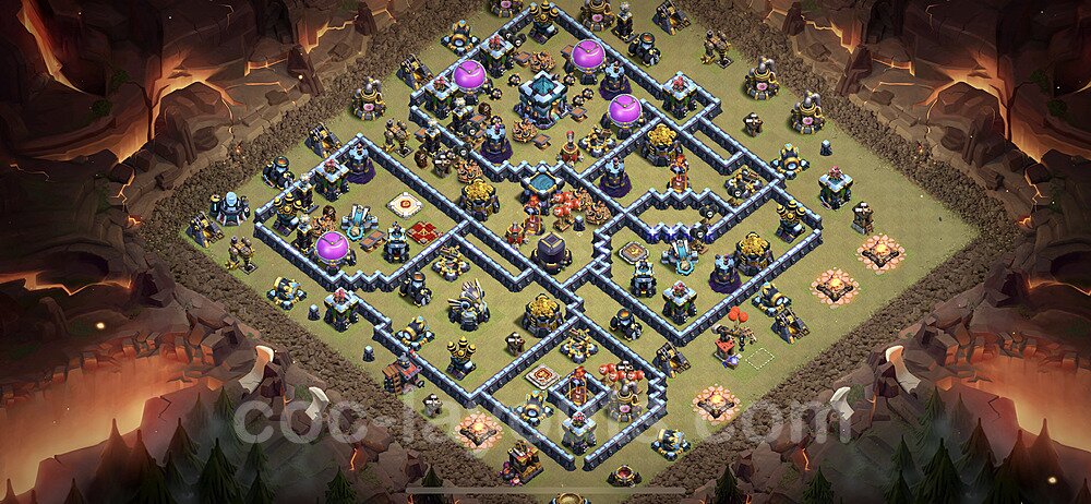 This Town Hall 13 hybrid base offers the best of both worlds - strong resource protection combined with effective trophy defense. The versatile design makes it an excellent choice for players who want to protect their loot while maintaining their trophy count. This balanced approach ensures you don't sacrifice one aspect of defense for another, making it ideal for active players across all league levels. The hybrid layout features centralized resource storages alongside a well-protected Town Hall, with multiple defensive layers that deter both farming raids and trophy pushers. High-value targets are strategically positioned within overlapping defense ranges, forcing attackers to make difficult choices about which objectives to prioritize. The compartmentalized design prevents attackers from easily achieving both loot destruction and the Town Hall kill in a single attack. Defense placement in this hybrid base creates strong coverage against both ground and air attacks. Inferno Towers, X-Bows, and Eagle Artillery work in concert to eliminate threats quickly, while splash damage defenses like Wizard Towers and Bomb Towers counter swarm strategies. The base's funnel-resistant design and strategic trap placement make it effective against popular attack strategies including QC LaLoon (Queen Charge Lava Hound Balloon), Blizzard attacks, and Yeti Smash compositions.