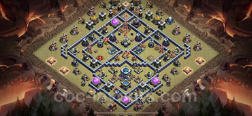 This Town Hall 13 war base is specifically designed to defend against 2-star and 3-star attacks in Clan Wars and Clan War Leagues. The strategic placement of defenses creates multiple compartments that force attackers to use more troops and spells than anticipated. Key defensive structures like Eagle Artillery, Inferno Towers, and X-Bows are positioned to cover crucial sections of the base, making it extremely difficult for opponents to secure a perfect attack. The core of this war base features a centralized Town Hall and Clan Castle, protected by multiple layers of walls and high-damage defenses. This layout forces attackers to commit significant resources just to reach the center, often leaving them without enough firepower to secure the Town Hall destruction. The anti-2-star design ensures that even if attackers breach the outer defenses, they'll struggle to achieve a 50% destruction rating. Air defenses are strategically spread to counter popular air attack strategies like LaLoon (Lava Hound + Balloons) and Electrone (Electro Dragons + Stone Slammer). The symmetrical trap placement and strategic Hidden Tesla positions create deadly surprise elements that can completely derail an attacker's plan. This base has been tested against various meta attack strategies and has consistently proven effective in preventing 3-star attacks.