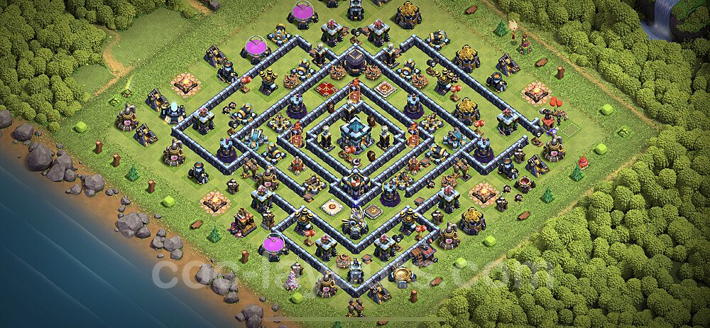This Town Hall 13 war base is specifically designed to defend against 2-star and 3-star attacks in Clan Wars and Clan War Leagues. The strategic placement of defenses creates multiple compartments that force attackers to use more troops and spells than anticipated. Key defensive structures like Eagle Artillery, Inferno Towers, and X-Bows are positioned to cover crucial sections of the base, making it extremely difficult for opponents to secure a perfect attack. The core of this war base features a centralized Town Hall and Clan Castle, protected by multiple layers of walls and high-damage defenses. This layout forces attackers to commit significant resources just to reach the center, often leaving them without enough firepower to secure the Town Hall destruction. The anti-2-star design ensures that even if attackers breach the outer defenses, they'll struggle to achieve a 50% destruction rating. Air defenses are strategically spread to counter popular air attack strategies like LaLoon (Lava Hound + Balloons) and Electrone (Electro Dragons + Stone Slammer). The symmetrical trap placement and strategic Hidden Tesla positions create deadly surprise elements that can completely derail an attacker's plan. This base has been tested against various meta attack strategies and has consistently proven effective in preventing 3-star attacks.