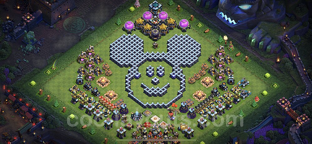 This Town Hall 13 war base is specifically designed to defend against 2-star and 3-star attacks in Clan Wars and Clan War Leagues. The strategic placement of defenses creates multiple compartments that force attackers to use more troops and spells than anticipated. Key defensive structures like Eagle Artillery, Inferno Towers, and X-Bows are positioned to cover crucial sections of the base, making it extremely difficult for opponents to secure a perfect attack. The core of this war base features a centralized Town Hall and Clan Castle, protected by multiple layers of walls and high-damage defenses. This layout forces attackers to commit significant resources just to reach the center, often leaving them without enough firepower to secure the Town Hall destruction. The anti-2-star design ensures that even if attackers breach the outer defenses, they'll struggle to achieve a 50% destruction rating. Air defenses are strategically spread to counter popular air attack strategies like LaLoon (Lava Hound + Balloons) and Electrone (Electro Dragons + Stone Slammer). The symmetrical trap placement and strategic Hidden Tesla positions create deadly surprise elements that can completely derail an attacker's plan. This base has been tested against various meta attack strategies and has consistently proven effective in preventing 3-star attacks.