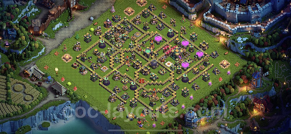 This Town Hall 14 hybrid base offers the best of both worlds - strong resource protection combined with effective trophy defense. The versatile design makes it an excellent choice for players who want to protect their loot while maintaining their trophy count. This balanced approach ensures you don't sacrifice one aspect of defense for another, making it ideal for active players across all league levels. The hybrid layout features centralized resource storages alongside a well-protected Town Hall, with multiple defensive layers that deter both farming raids and trophy pushers. High-value targets are strategically positioned within overlapping defense ranges, forcing attackers to make difficult choices about which objectives to prioritize. The compartmentalized design prevents attackers from easily achieving both loot destruction and the Town Hall kill in a single attack. Defense placement in this hybrid base creates strong coverage against both ground and air attacks. Inferno Towers, X-Bows, and Eagle Artillery work in concert to eliminate threats quickly, while splash damage defenses like Wizard Towers and Bomb Towers counter swarm strategies. The base's funnel-resistant design and strategic trap placement make it effective against popular attack strategies including QC LaLoon (Queen Charge Lava Hound Balloon), Blizzard attacks, and Yeti Smash compositions.
